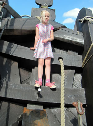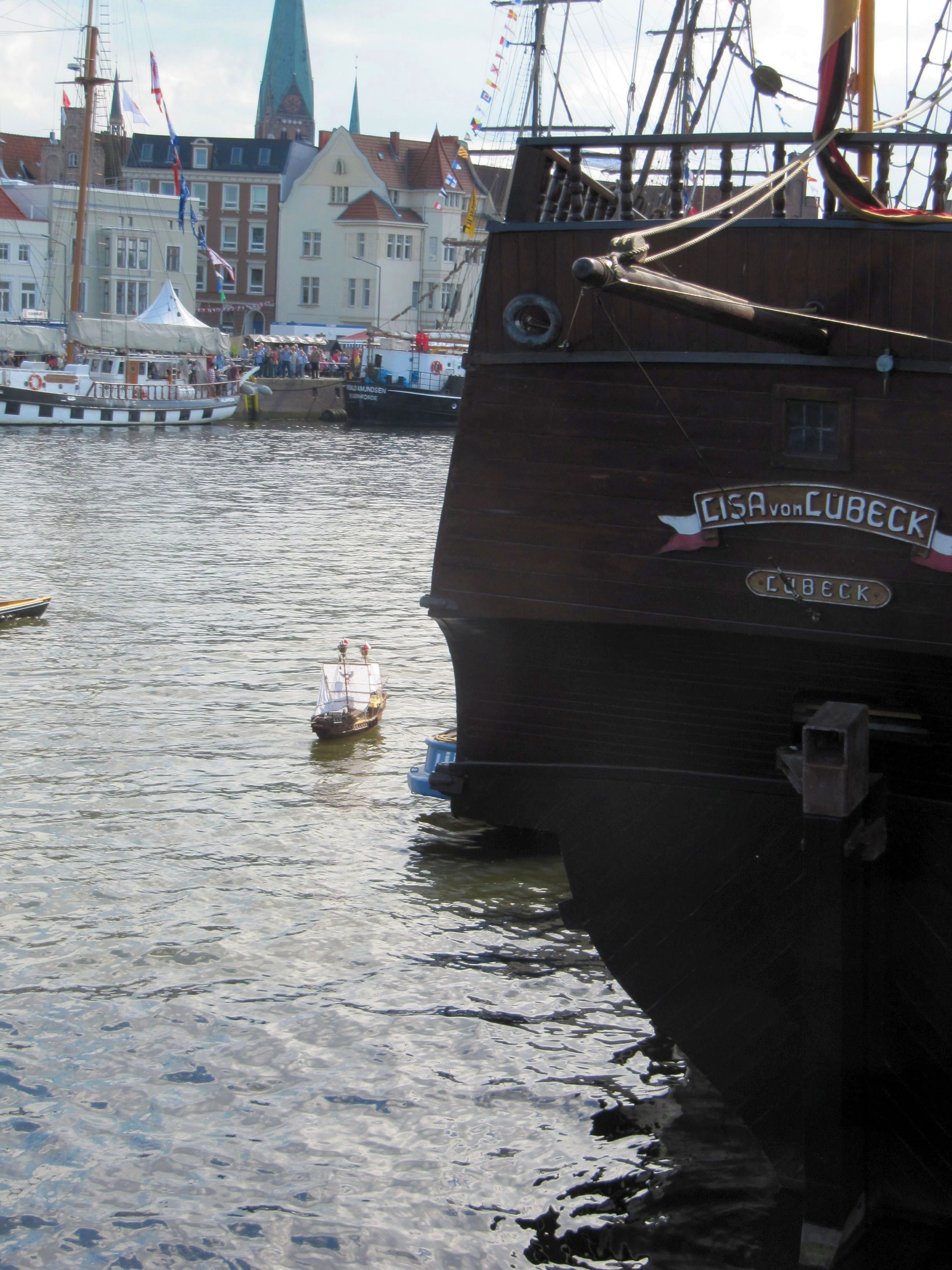Uns' Emily hett sik den Unwillen vun de Koggen-Lüüd totrocken, wiel se överall rümkladder un eenmal as so'n Galionsfigur vörn in'n Bug hüng. Wi harrn nich goot noog uppasst un Emily harr't utnütt. De ollen Hansescheep hebbt in'n Lübecker Hafen so'n lütt Seeschlacht simuleert. De Kieler Kogge hett angrepen un de Koggen "Ubena vun Bremen" und "Wissemara" ut Wimar hebbt de Kieler in de Kniep nahmen. An'n End hett de Kraweel "Lisa vun Lübeck" (na klaar!) de Kieler Kogge besiegt. De Wind weer so sachen, de Scheep kunnen ünner Segel in'n Hafen manövereern. En wunnerschöön Anblick! Mi hebbt se gefullen, de Hansedaag in Lübeck! 29.5.2014