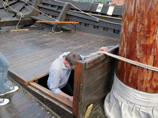 Staunt hebbt wi över de gewaltig Ruderpinne. De Mann an't Ruder, de kann överhaupt nich kieken, wohen he stüürt. He kreeg Befehl vun baven. Dor stünn jümmers een, de utkeek un Bescheed geev. Staunt heff ik ok över de lialütt Kombüüs. Würklich, kuum dat sik dor een in ümdreihn kann. Winzig! Un denn keem Lütt-Emily mit de ganz wichtig Fraag: "Un wo is eine Toilette?" Un kuum to glöven de weer ok dor. Du müsst so'n beten dalklattern un dor weer denn en Brett mit en rund Lock. En Plumpsklo. Allens füll glieks dal in't Water. Ik heff mi dat Geschäft denn bi Seegang vörstellt, bi kabbelig See