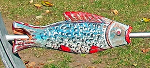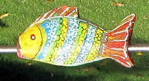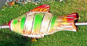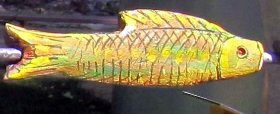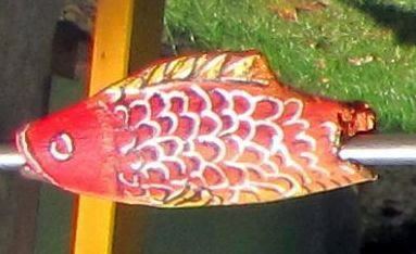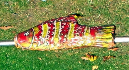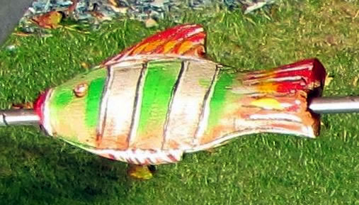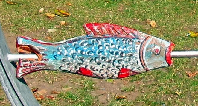 "Achteran schöpf he dat Gröön, Ik heff blots wenig photographeert leider ik weer to dull mit Kieken beschäftigt. Man vun den Dag heff ik ene Upnahme maakt, as Gott de Deerten in't Water un in de Luft maakte, as he also ok de Fisch maakt hett. Ünnen leeg blaag farvt Sägespäne un dor över weer en Ring mit wunnerfien bunte Fisch. "He füng glieks an. Toeerst schöpf