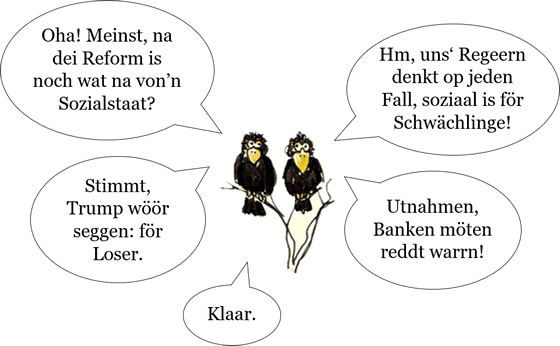 vun Behrend Böckmann Dat gaude Läben hett Grenzen, wiederhen so läben as bet hüt is nich tau betåhlen, dit System knen wi uns nich mihr leisten, so dei Kanzler Fiete Merz, dei Sozialstaat möt reformiert warden... So möt dat Börgergeld reformiert warden, dormit wedder mihr Minschen Lust up Arbeid kriegen, un dorher möt dei Kranken-, Plääch- un Rentenversäkerung nie dörchdacht warden, dormit allens betåhlbor blifft. Un denn kümmt 'n Rentenkommis'schon tauhoop, in dei sik wull taun gröttsten Deil bäderstellte Pangschonäre 'n Kopp måken. Un dat keem nich so gaut an, un dor dat mit dei Wirtschaft ok nich so löppt, as dat verspråken wür denn Arbeid sall doch wedder bäten mihr inne Kniep inbringen as blot mit Börgergeld up't Sofa sitten , wägen all dat sall'n miteinst länger arbeiden, sall den Staat nütz sien un dei Rent upbädern.
