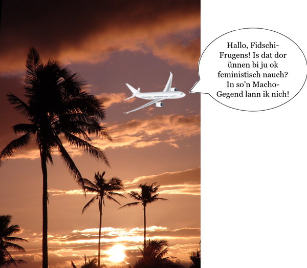 Dei Südseereis vun Behrend Böckmann Nu harr sik dei Baerbocksche as feministisch gräune Ministersch för Butenangelägenheiten väl vörnåhmen un wull sik in'n Austmånd 'ne Wäk inne Südsee uphollen, üm taun einen noch bäten Frugensfautball tau beläben, un taun annern wull's dei Regierungen von Australien, Niegen Seeland un Fidschi bewägen, sik wiederhen gägen Moskau uptauböhmen un noch mihr för dei Ukrain tau daun. Mit 'n Flieger vonne Bereitschap un föftig Mann Angturåsch geiht dat inne Luft, måkt 'n Twüschenlannung in Abu Dhabi, üm Sprit för den Wiederflauch tau tanken – un denn... denn gåhn dei Lanneklappen nich tau, dei Fleiger dreiht 'n Runn œwer't Wüstenemirat, lött 80 t Kerosin einfach so af un kann denn wedder lannen. Dei tweite Anloop verlöppt nich anners, noch eins 80 t Kerosin einfach so verschüdden un wedder lannen. Nu is dei Reis ut. Nicks mit Frugensfautball, nicks mit diplomatisch Ünnerhollungen, nicks mit dei Rückgåf von Kulturgäuder ut'e Kolonialtiet anne Urbevölkerung, nicks mit dei Botschaftsfieer inne Hauptstadt Suva up Viti Levu (dei gröttst von mihr as 300 Inseln, dei den Staat Fidschi billen), wo inne düütsche Residenz (den Sitz von'n Diplomaten) dei utbillt Diplomat Dr. Andreas Prothmann (Johrgang 1960, mit Erfohrungen twüschen Moskau, London un New York un tauletzt düütscher Botschafter in Duschanbe/Tadschikistan) mit dei böbelsten Fidschianer un dat ganze fidschiaansche Kabinett ümsüss up Annalena täuwt hett. Dat Inselriek hett sik 1970 von't inglisch Mudderland löst, beläwt einen Putsch un noch 'n Putsch un gifft sik nu demokratisch, wull ok, dor dei Klimawannel för dei Inseln taun Gefohr ward un man as Dreihkrüz twüschen China un dei westlichen Länner 'n Wurt miträden kann. Dei Baerbocksche secht: „Im Indo-Pazifik haben wir nicht nur enge Freunde und Partner. Die Region wird die Weltordnung des 21. Jahrhunderts prägen.“ Also möt 'n dei Regierungen, dei uns westlich Frieheit un Demokratie för gaut befinnen, bäten Honnig üm't Mul schmeern, dormit's sik nich so benähmen as dei Putschisten in'n Niger in Westafrika. Inne Südsee is wull gaut Faut fåten, denn ok all dei düütsche Kaiser hett tau sien Tiet disse Gägend för bedüdend hollen un Samoa so gaut kolonisiert, dat sik öllere Minschen noch dorup besinnen, dat up Samoa „unser Düütsch“ schnackt wür. Ja, Fidschi licht nich wieder af von't einstig Düütsch-Samoa as Flensborg von Berchtesgaden. — Dunnemåls wull dei Kaiser up Samoa Faut fåten, üm mit sien Kriegsschäpen dichter an'n Japaner rantaukåmen, un dat hütig Düütschland will wull 'n Insel inne Südsee finnen, üm den Chinesen up'e Pell tau rücken. Un dortau richt 'n in dissen Südsee-Inselstaat mit knapp 'n Milljon Inwåhners 'n eigenstännig Botschaft in un bestellt 'n Botschafter, dei sik bestimmt nich blot üm düütsche Touristen kümmern sall, dei up Fidschi dükern willen. 22.8.2023