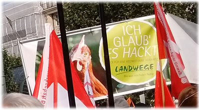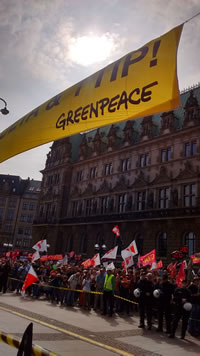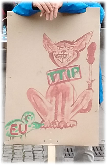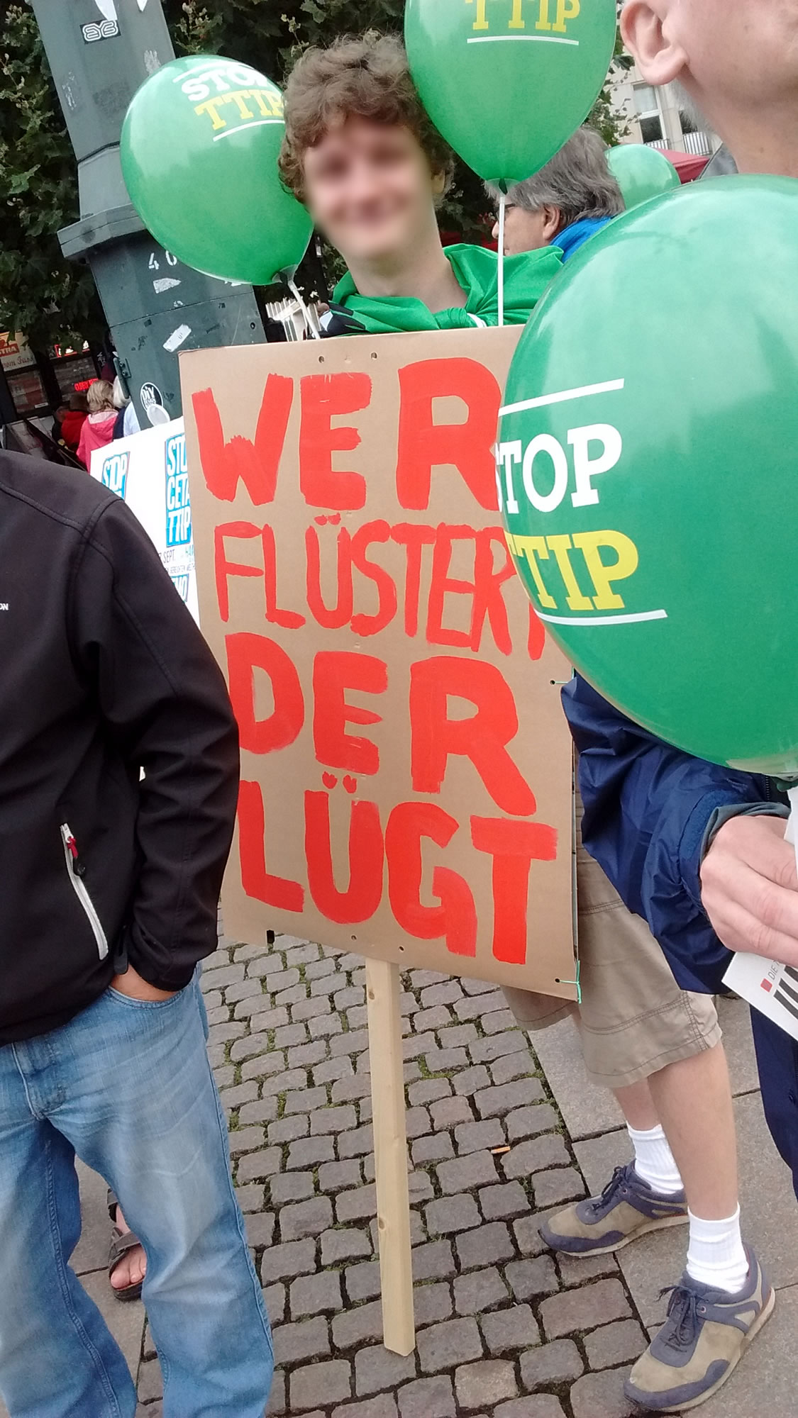 De Reden will ik nich wedderhaaln; bi solk Veranstalten is ja tomehrst al Konsens. De Reden weern good, Fruuns vun de Kark, ut de Landweerschap un vun de Organisaschoonsgrupp hebbt spraken; un de Musik weer 1 a. Tovörderst avers gah ik na so'n Demo, üm Lü to drapen, ehrn Optoog un ehr Plakate to sehn, mit ehr to snacken un ehr Sichtwiesen wiestokriegen. Hier de schöönsten Plakate vun de Demo gegen TTIP un CETA (sünner Gewähr mach ween, dat mi noch schönere dörchflutscht sünd). Sünnerlich gefallt mi ja jümmers de sülven maakten, handmaalten mal mehr, mal minner originell. Besünners toseggt hett mi bi de Optaktveranstalten Klock 12 op'n Raadhusmarkt de liedenschapliche Reed vun de Melkbuursche, de in to Harten gahn Wies un Wöör klorstellt hett, wat för'n Gefohr de Afkamen för de Landweerschap in lütte Familienbedreven is se warrt över de Kling springen, bloots de Agrarindustrie warrt TTIP överleven. Wieldat dat de Nohren en Punkt is, de all direkt bedrepen deit, leeg dor groot Gewicht op, so hebbt ok Buurn mit ehr Treckers den Demo-Toog anföhrt, as he sik so bi Klock een Richt Alster in Bewegen sett hett. Good gefulln hett mi noch de Redner vun Greenpeace, de in sien Iever verspraken hett, "Zitip un Teta" to Fall to bringen (sünd dat noch twee Afkamen? Ik dach, wi harrn mit Titip un Zeta noog...)
