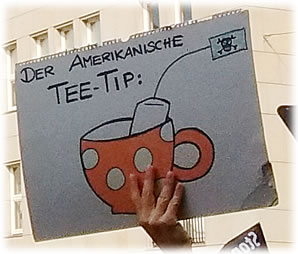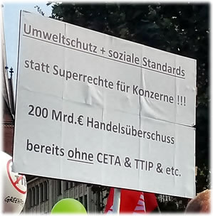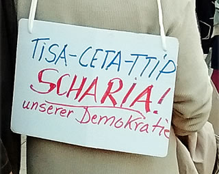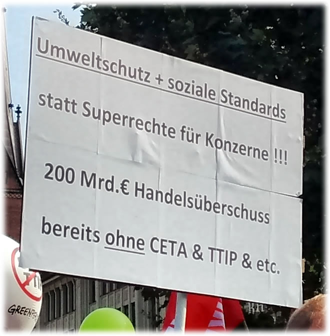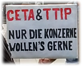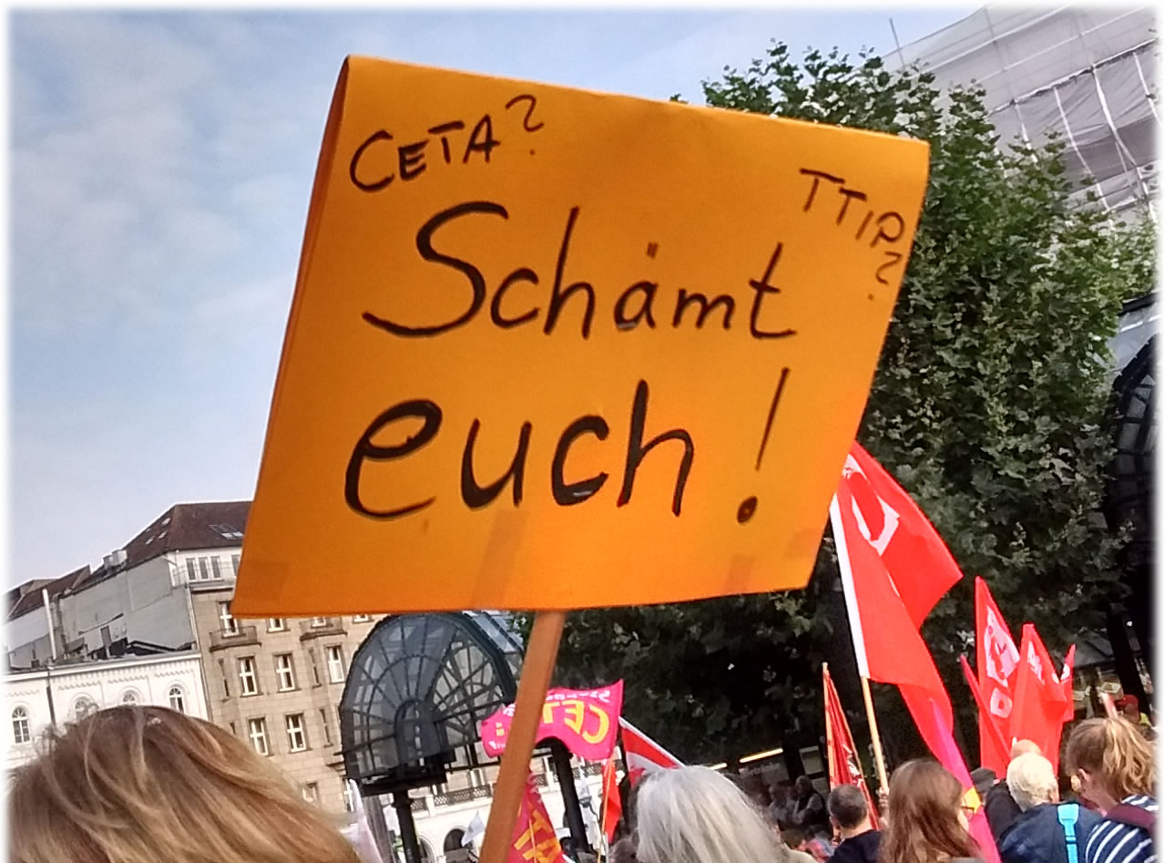 Mit de twee "Hannelsafkamen", sünnerlich mit CETA, warrt dat nu hoge Tied, dor noch en P dorvör to setten. De Argumenten mööt wi hier nich wedderhaaln, al vör Johren hefft wi gode Quelln dorto hier bi Plattpartu verlinkt. Dat geiht üm nich weniger as uns Demokratie gegen de Övernahm dör de Weerschap to verdeffendeern. Ganz sülvstlos wüllt de Grootkonzerne uns ok noch de letzten frien Entscheiden afnehmen! Mennig vun de Argumenten staht hier un welk staht ok op de Plakaten op. Snaaksch is, dat vundaag masse Lü uns ach so sülvstbestimmte Levenswies gegen "Frömde", Migranten, Flüchtlinge verdeffendeern wüllt, de angeevlich bloots Kosten bringt un keen Stüern tahlt; dat avers de Profitgier vun internaschonale Konzerne, de narms Stüern tahlt, en veel grötter Bedrauhn ween kann, is ehr nich bewusst. Man de Industrielobbies laat ja nich locker, as'n Hund, de sien Büüt nich ut de Fäng geven will. Dat neegst Afkamen, dat se versöökt, warrt TISA ween; dor geiht dat üm Deenstleisten. Weer dat nich schöön, wenn endlich ok uns öffentliche Waterversorgen privatiseert wöör un Nestlé orr RWE uns slechter Water to höger Priesen verköpen dä? Süh, dat kriegt wi mit TISA. Alternative: Hier. Un wählen. Un demonstreern.