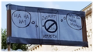 De Lü vun Greenpeace harrn ok wedder Klabasterers mitbröcht, de twüschen de Pieler direkt vör't Raadhus en groot Transparent anbröcht hebbt. De offizielle Verantwoortliche müss ehr pro forma mehrmalen över Luudspreker beropen un seggen, dat weer nich inplaant, se schulln nu rünnerkamen; man nix da, se hebbt seelenruhig wiedermaakt. Dat leet, as weer dat stillkens en Övereenkamen. Nüms hett wat dorgegen daan, ok de Udels nich, de de ganze Akschoon afsekert hebbt. Se harrn wiss ehrn Spaaß un weern in't Hart ok bi de Demonstranten.