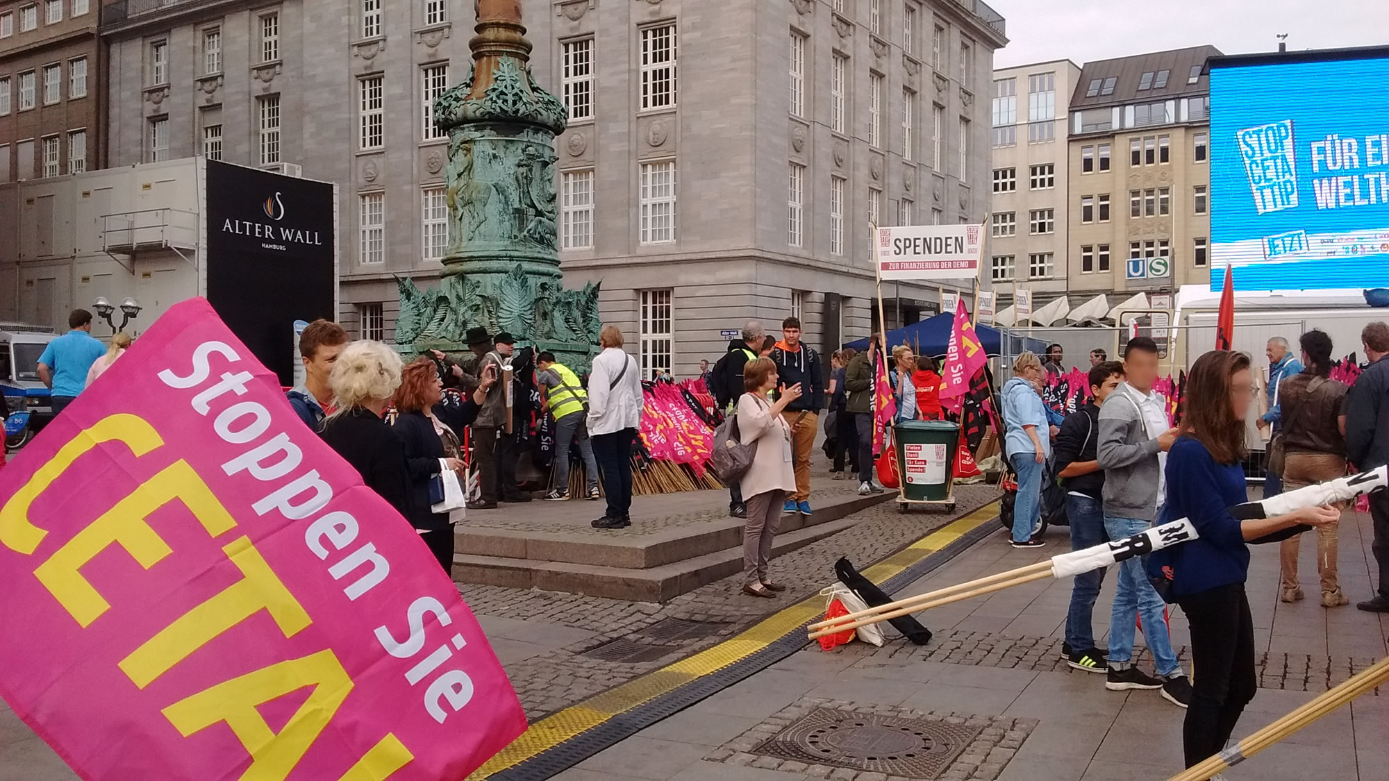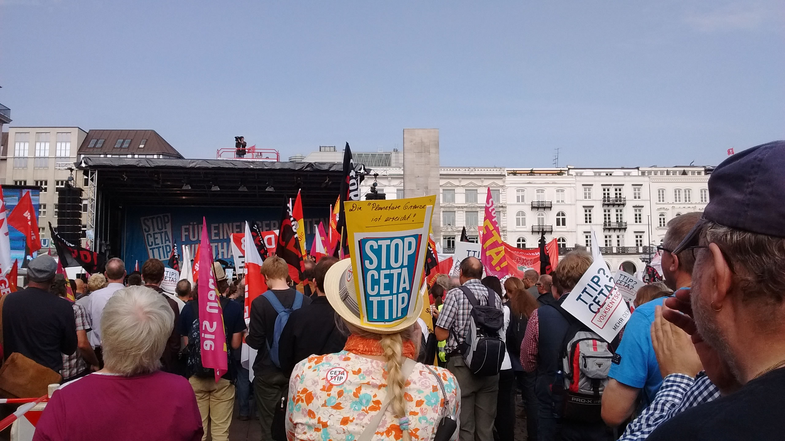 För all, de gistern an'n 17.9. nich hebbt dorbi ween kunnt, hier en lütt Bericht vun de grote Demo gegen TTIP un CETA in Hamborg. Fiefunsösstigdusend schallt dat west hebben dat sehg aver na mehr ut, de Raadhusmarkt weer rappelvull. De Demo füng offiziell Klock 12 an, dor weer de Sünn al rutkamen ik heff mi en lütten Sünnenbrand haalt , man de hele Tied kemen Lü dorto, un ok as ik na Klock twee vun den wannern Toog weggahn bün, kemen mi noch Lü ut de Bahnstaschoonen tomööt mit Plakate ünnerwegens na de Demo. Dor sünd sachs welk Sünnertöög to laat west orr so.